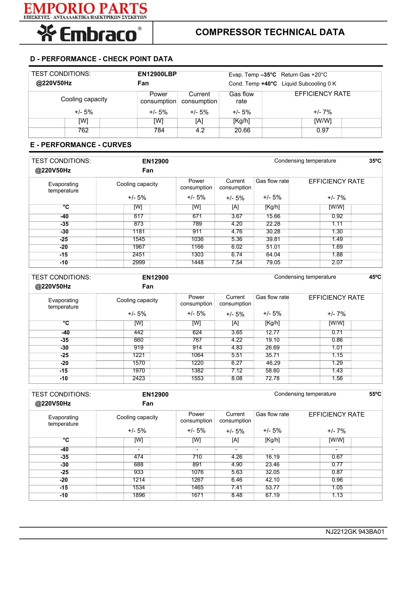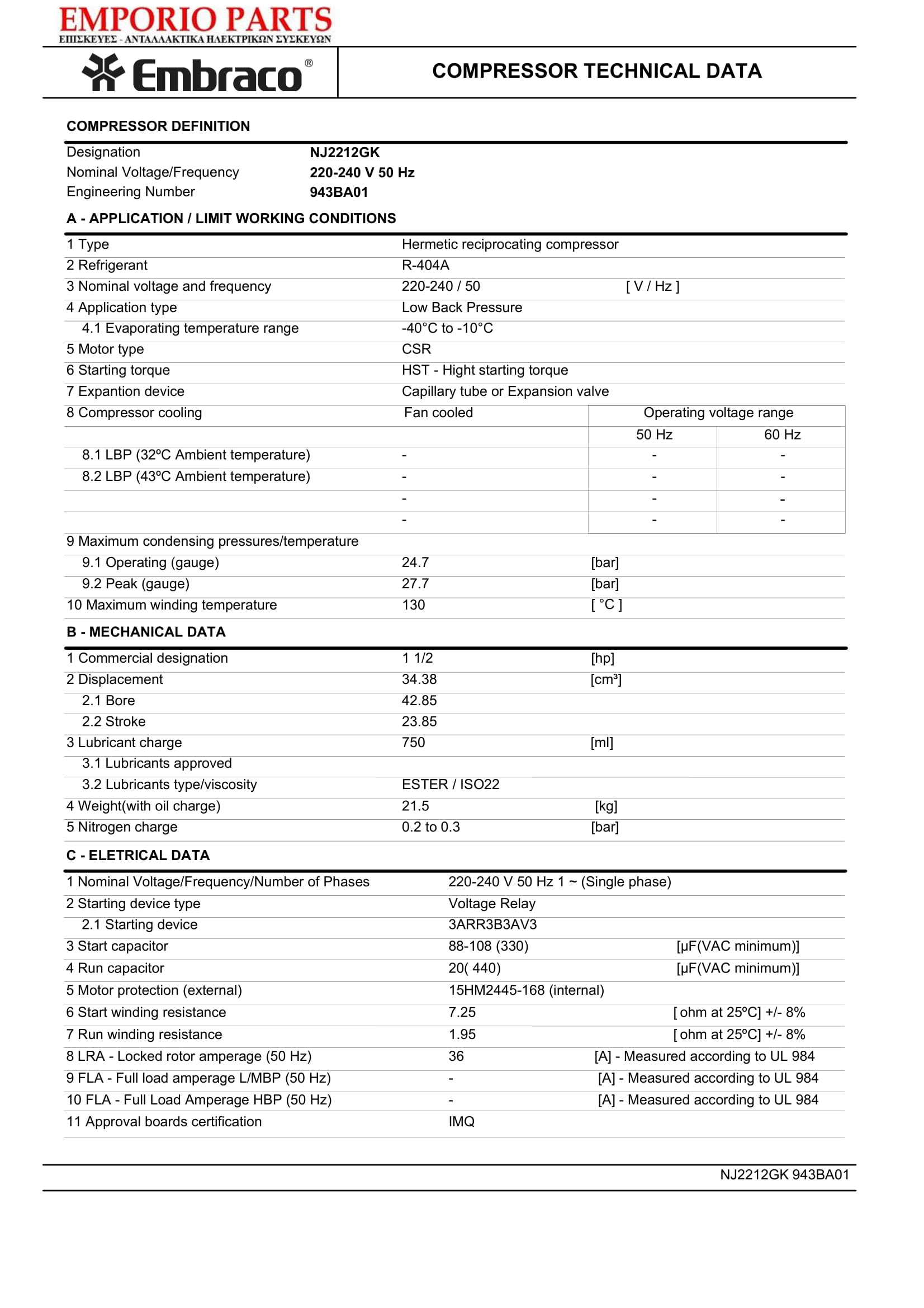 Embraco-Aspera NJ2212GK (1,5HP / 230Volt / R404a) Κομπρεσέρ Ψυγείων